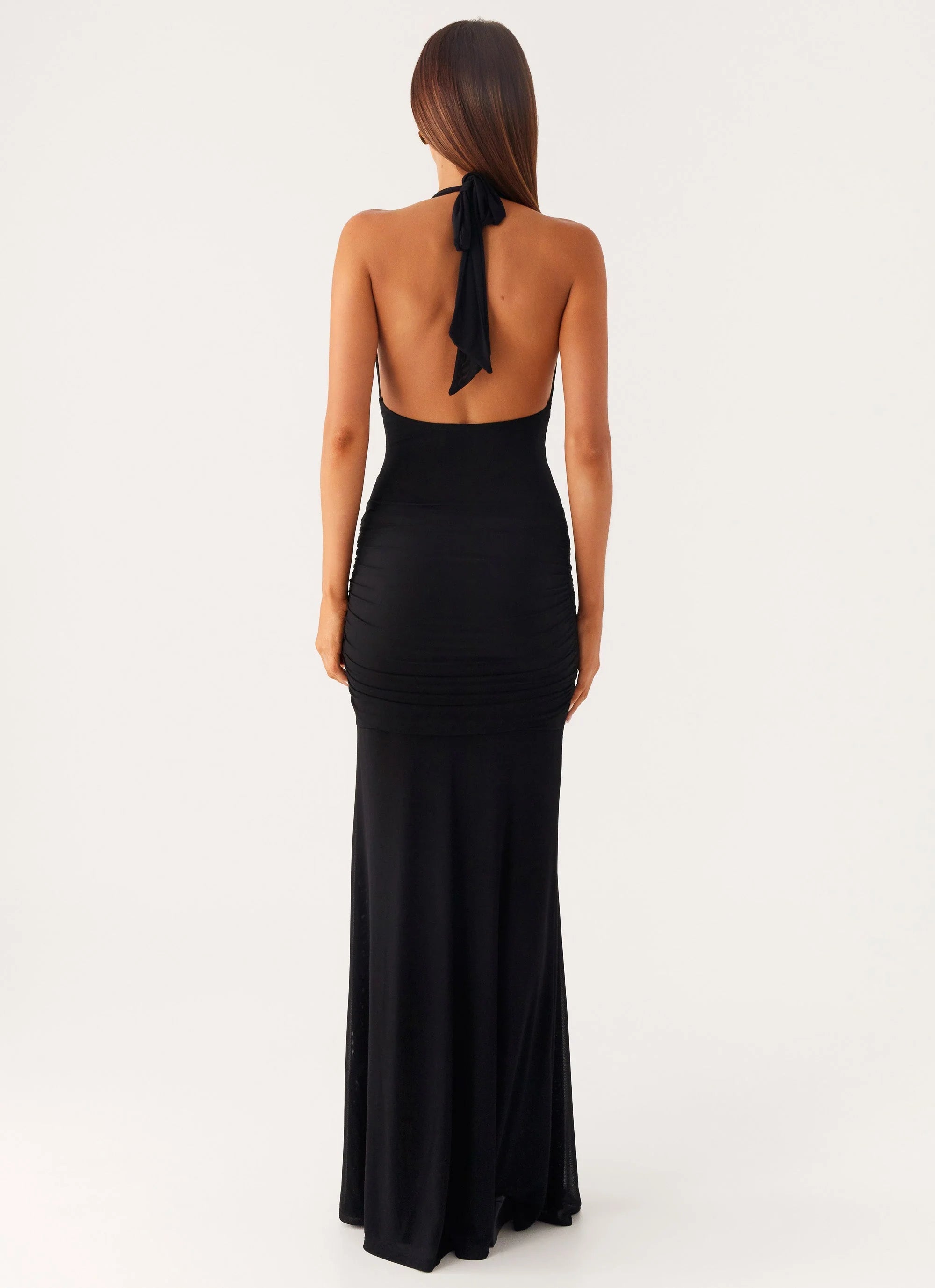The Miyah Halter Hardware Maxi Dress is a show-stopping bodycon style made for golden hour moments. Crafted in stretch mesh, it features a halter V-neckline, fully lined bustier and skirt, and side ruching for a flattering silhouette. Finished with thick long straps, gold embellishments, and a low back for effortless evening glamour.