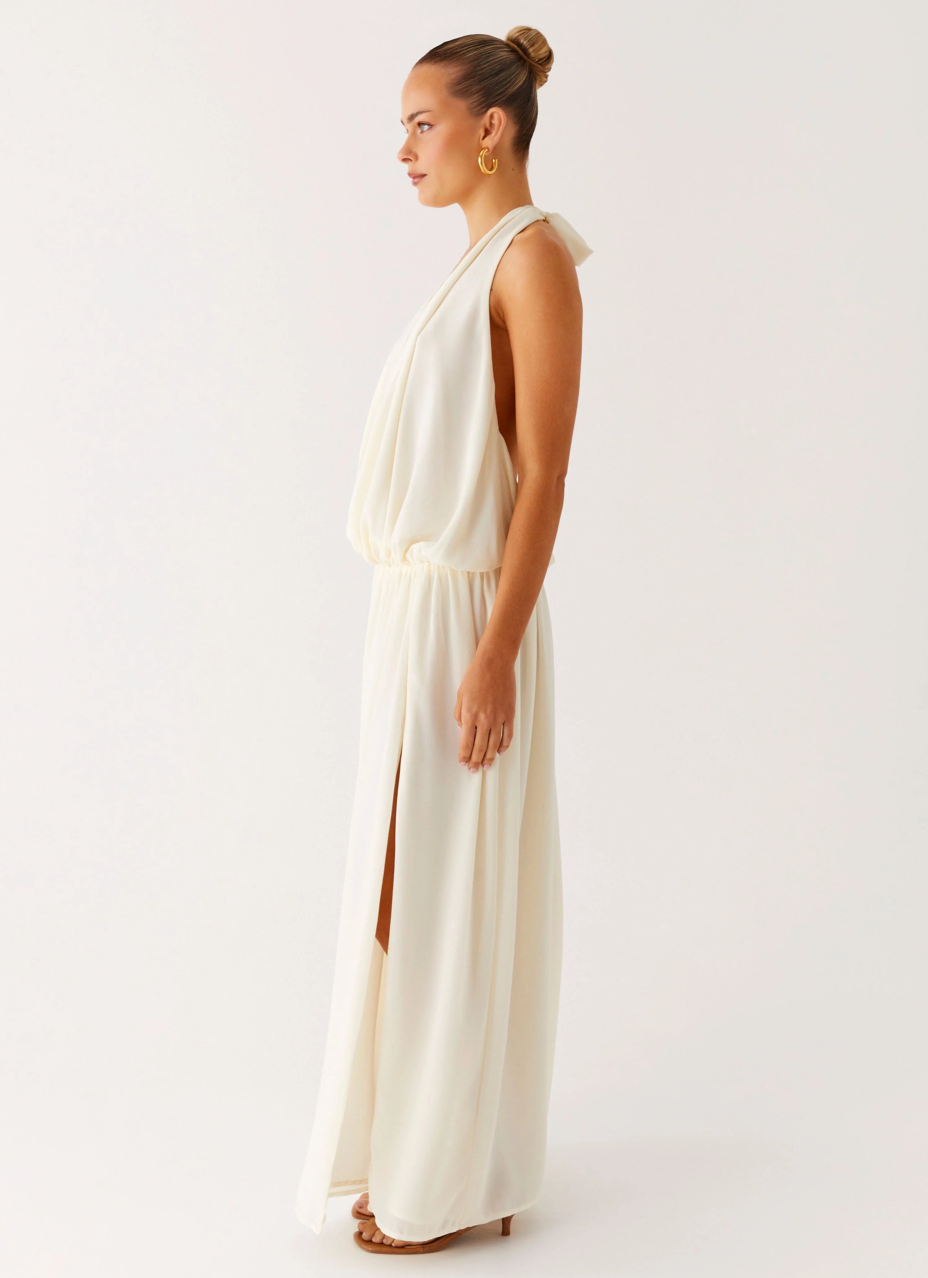 The Narlah Halter Maxi Dress is made for golden hour moments and late-night magic. Featuring a deep V neckline with halter neck tie straps, ruched waist, and a front side split, it flows effortlessly with a fully lined, low back design.