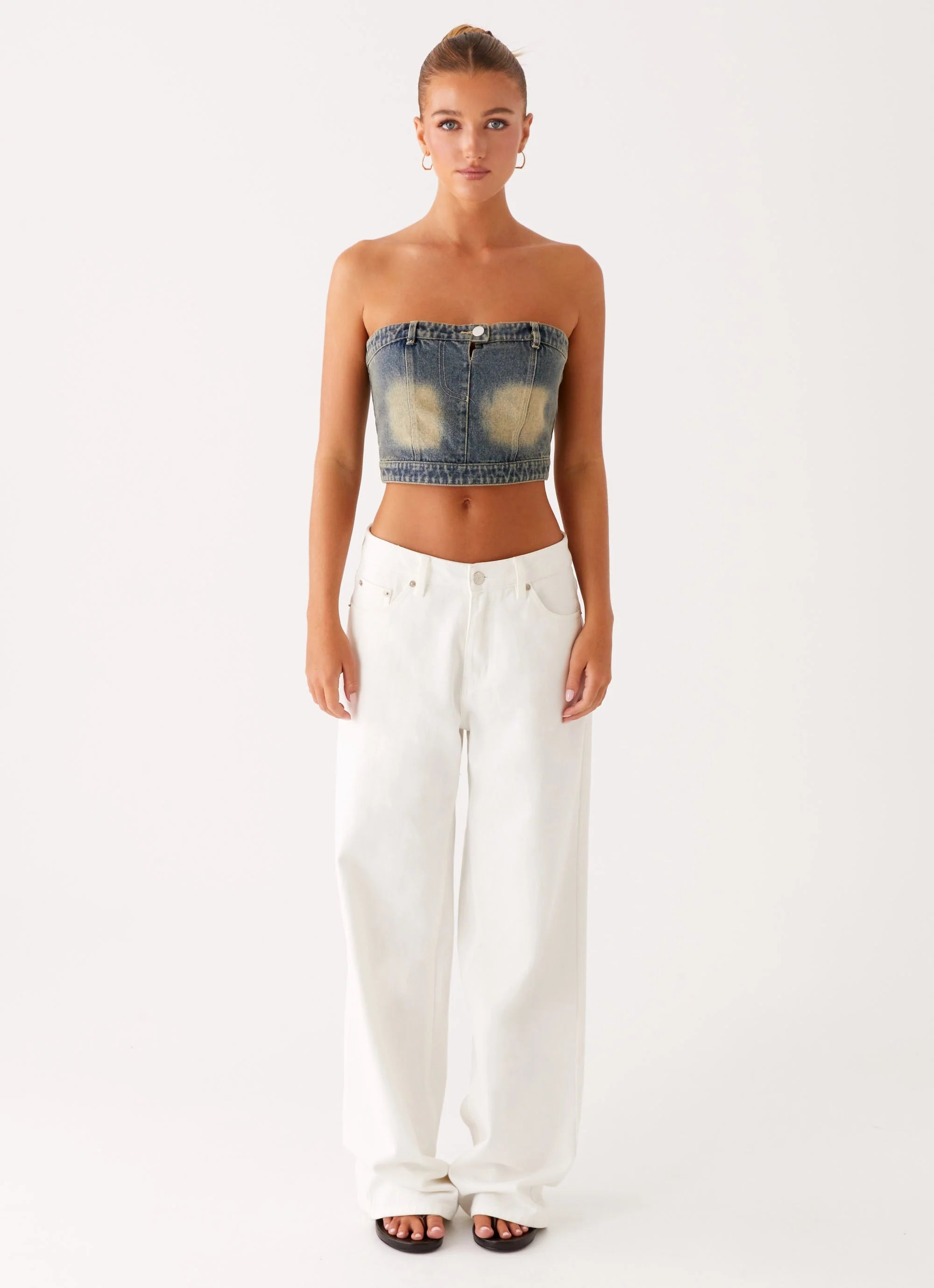 Turn heads in the Not Like Us denim top—a statement piece for nights that start with golden skies and end under starlit horizons. Featuring a sleek strapless neckline, it hugs your silhouette with effortless edge. The back metal zipper adds a bold finish, while the unlined design keeps it lightweight for balmy nights and dance-floor moments.