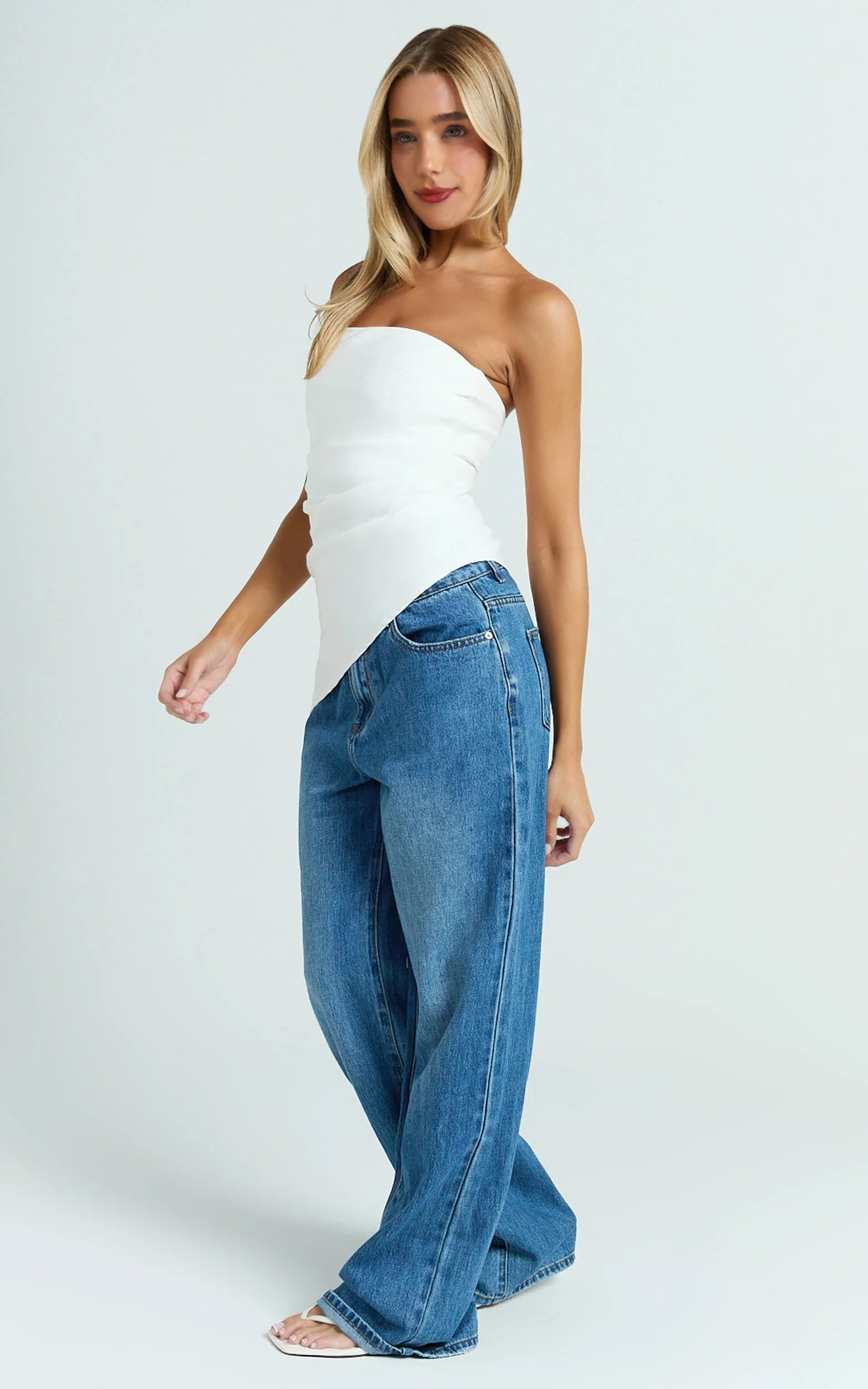This top achieves an effortlessly cool look with a smooth strapless neckline and an angled hem that cinches the waist and elongates the body. You can style it with sleek trousers and delicate heels for an elegant appearance, or tuck it into a midi skirt to enhance your weekend outfits. It's the perfect choice when you want to look stylish, streamlined, and camera-ready.