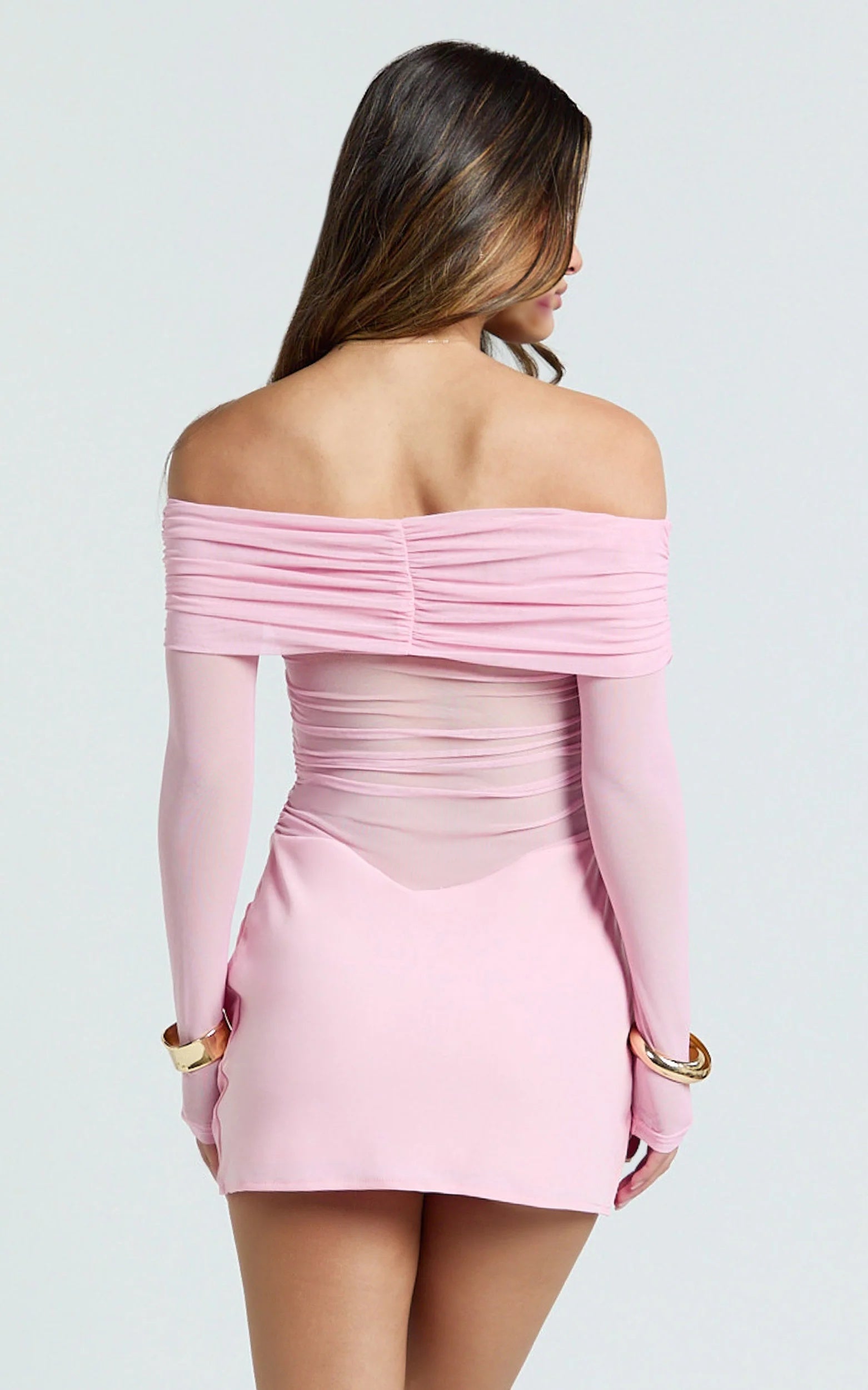 The soft pink color and draped bias cut are extremely flattering. The long sleeves and off-shoulder neckline bring out a trendy coquette style, which is very popular this season. This dress is designed to highlight your curves with a fun and elegant touch. It makes you the center of attention whether you're going for a drink or joining virtual fashion shows with friends.