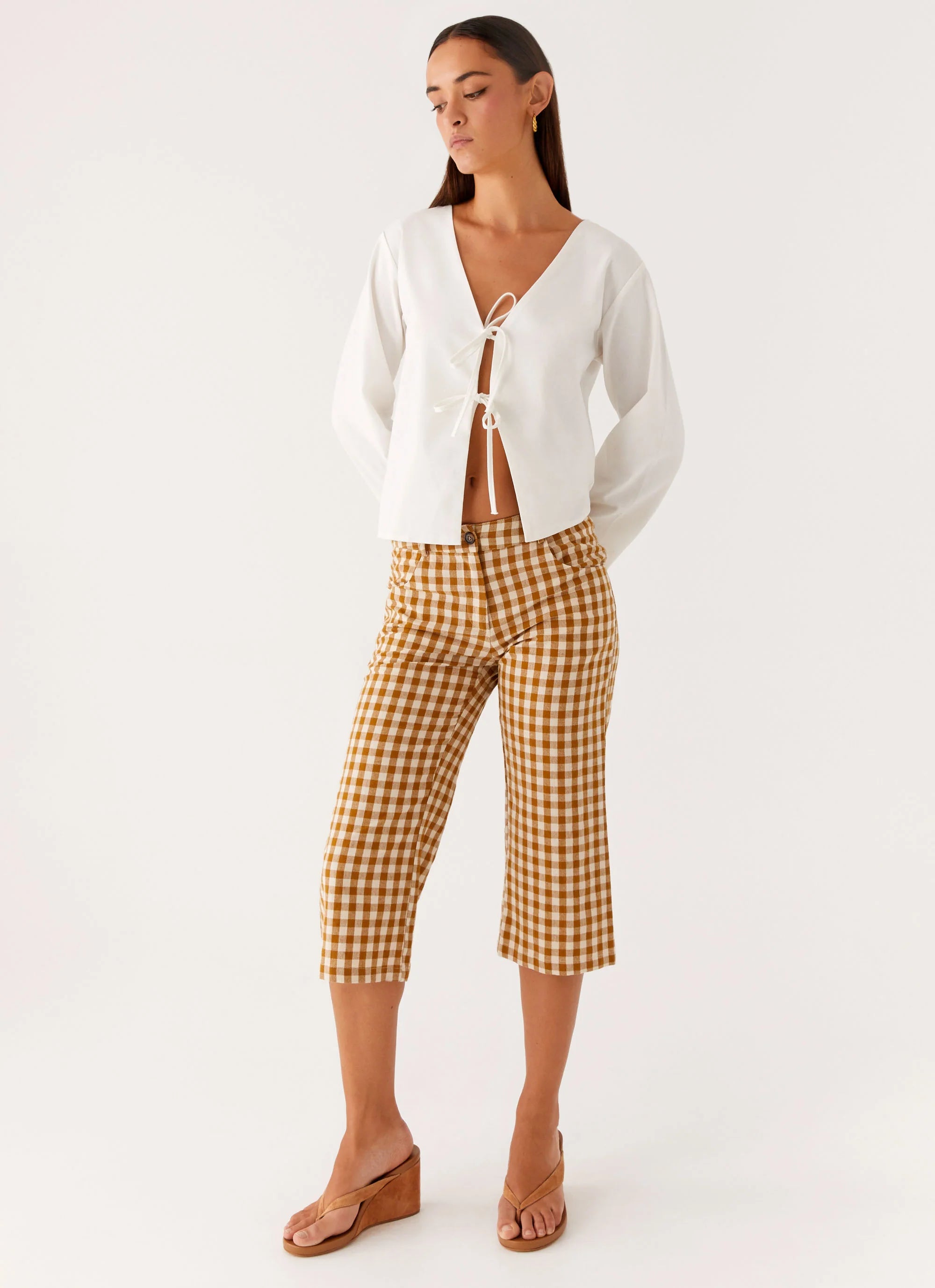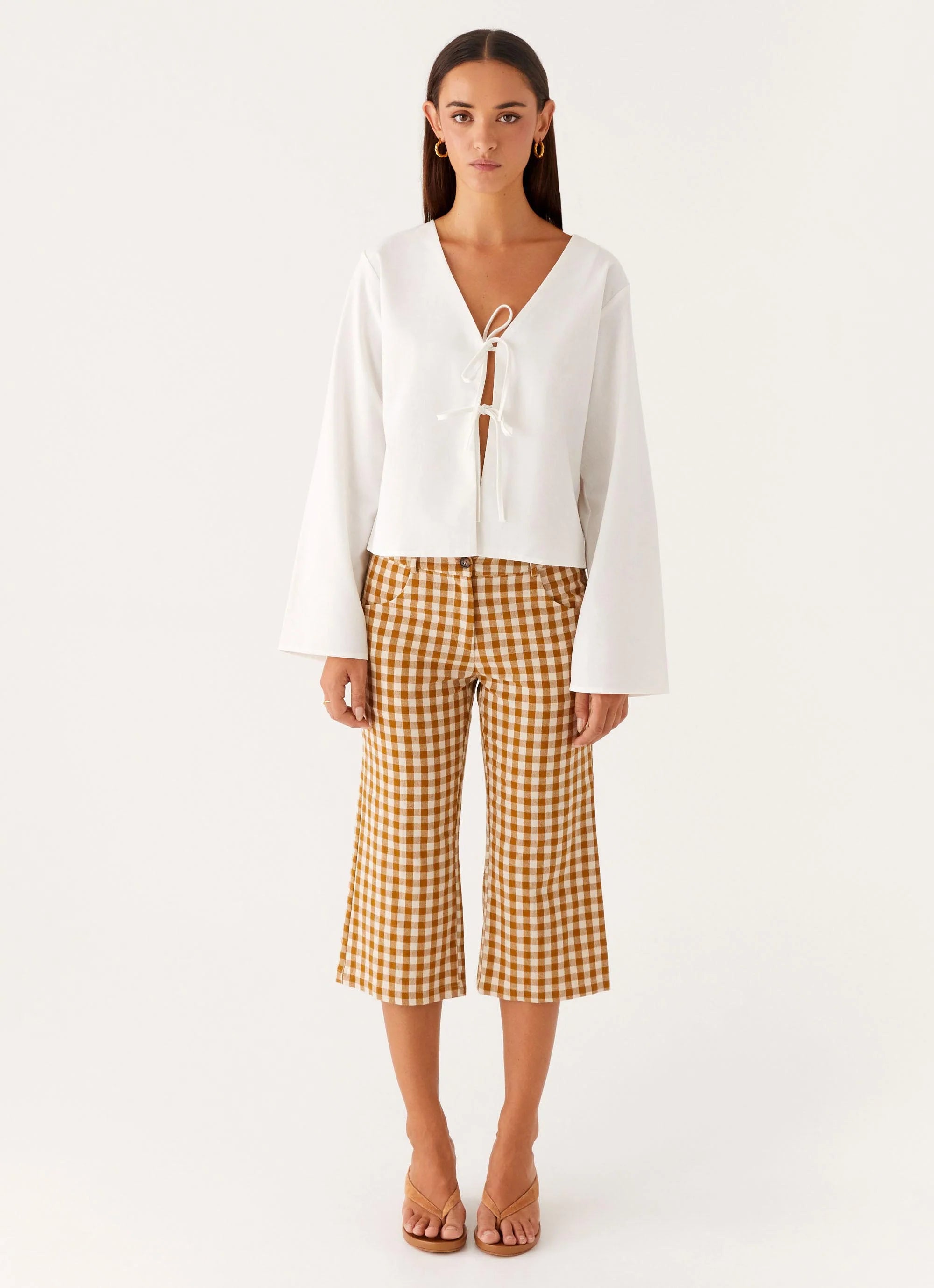 The Radley Capri Pants feature a low-rise fit with belt loops and a 3/4 length, offering a stylish and versatile option for warmer days. These pants are designed for effortless wear, combining comfort and chic simplicity.