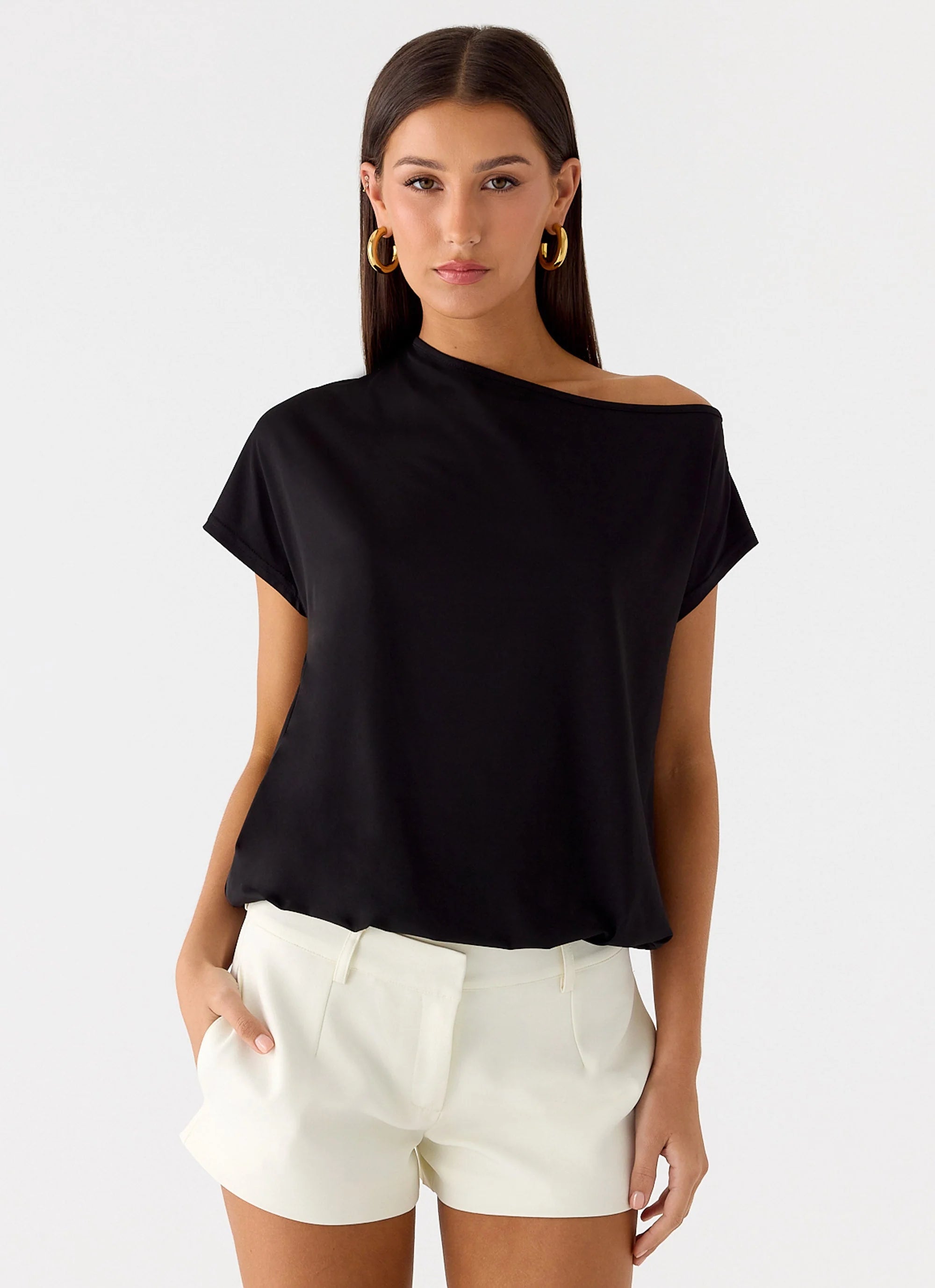 Elevate your look with the Raeni Off Shoulder Top. Crafted from stretch jersey, this statement piece features an off-shoulder neckline with a draped cowl back, secured by a delicate neck tie. Designed with a ruched, draped waist and a flattering waist hem panel for a contoured fit.