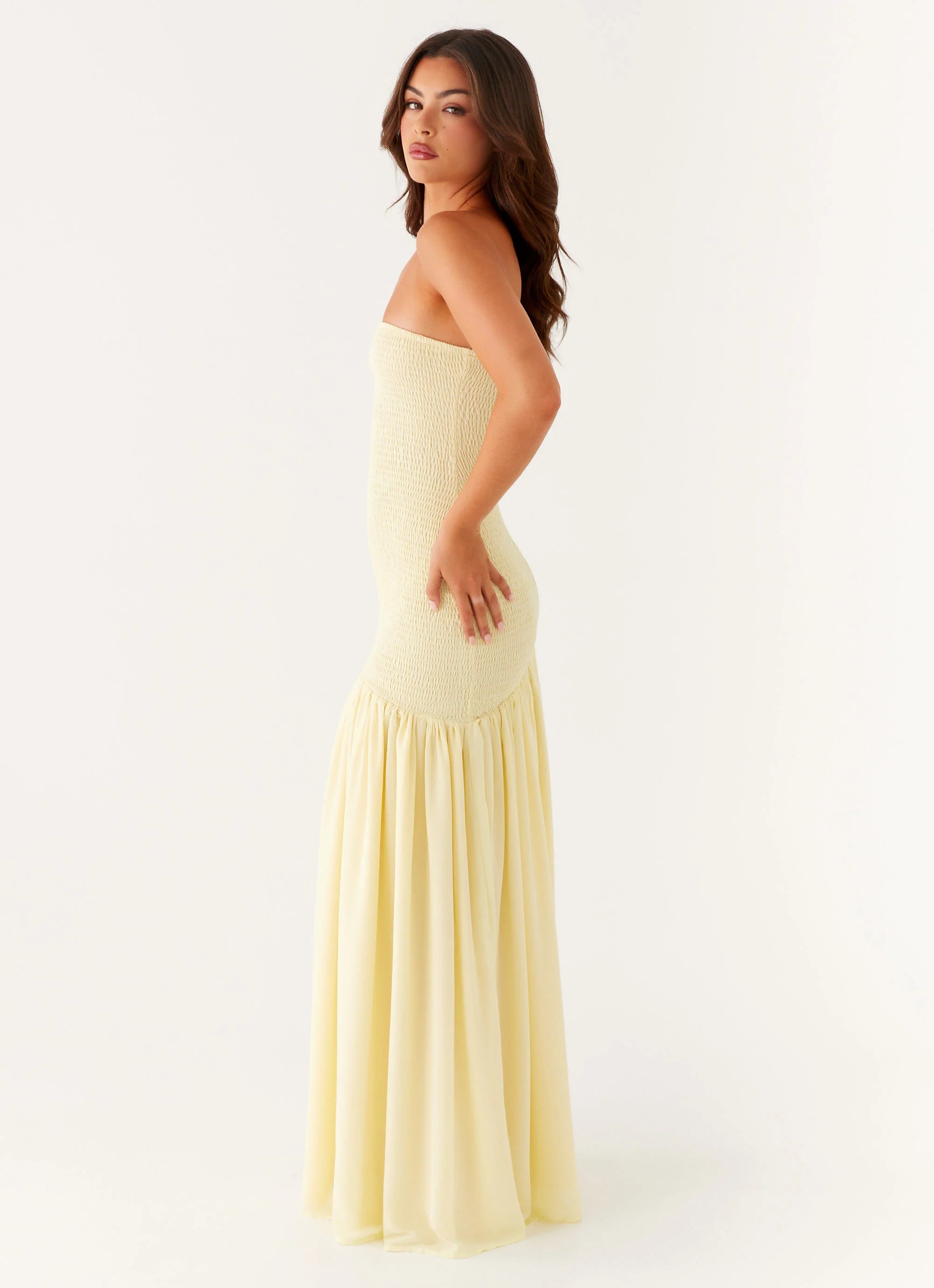 - Strapless neckline