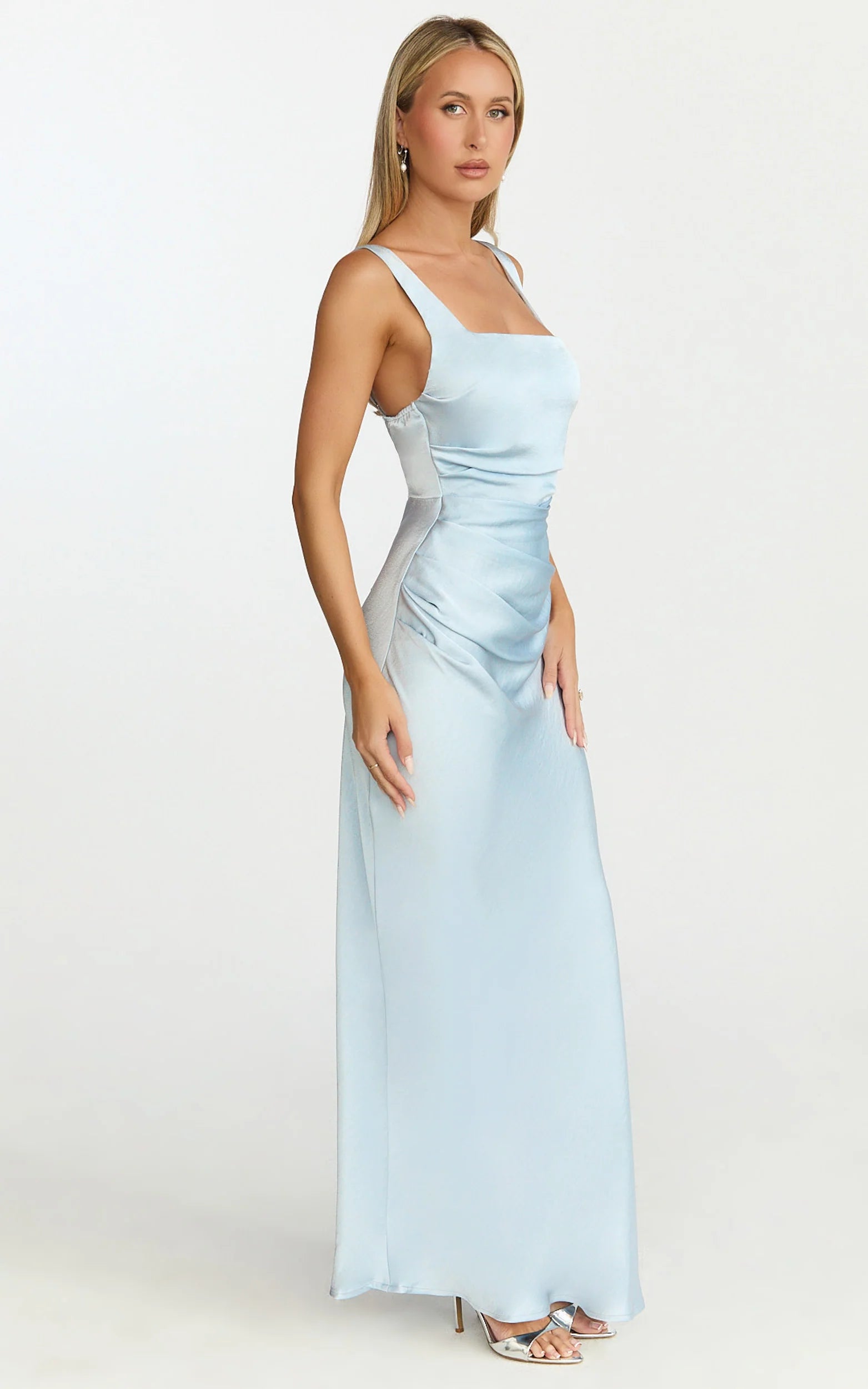 Slip into the Rumi Midi Dress – Ruched Bodice Satin Dress in Pale Blue when you want confidence on cue. It’s the kind of blue that brightens your skin, the kind of fit that says “I’ve got this,” and the kind of polish that works for weddings, cocktails, and every dressed-up moment in between.