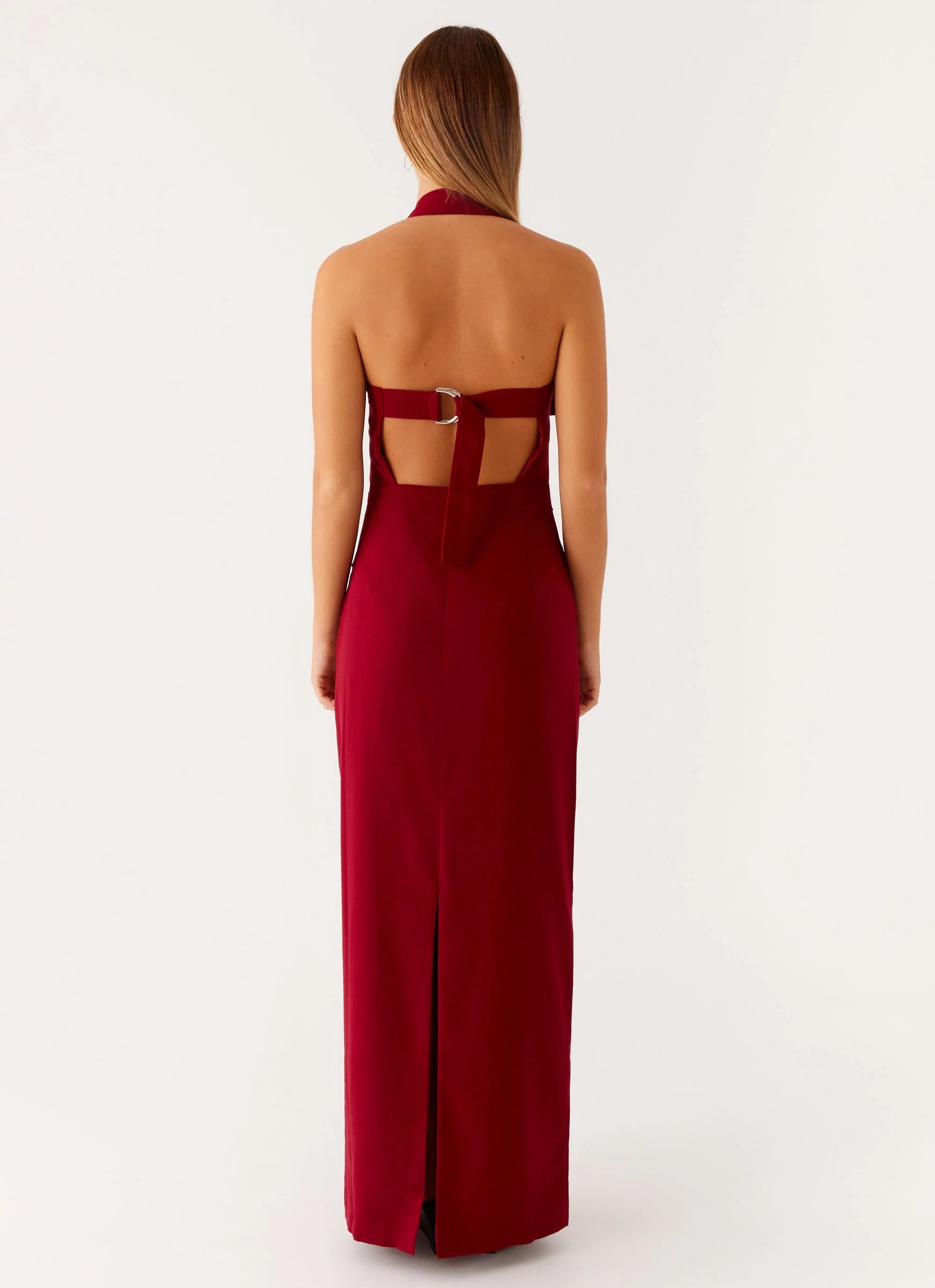 The Rumour Has It Maxi Dress is made for nights that leave a mark. Crafted from sleek satin with a halterneck, button front, and flowing silhouette, it’s a bold red statement built for the spotlight.