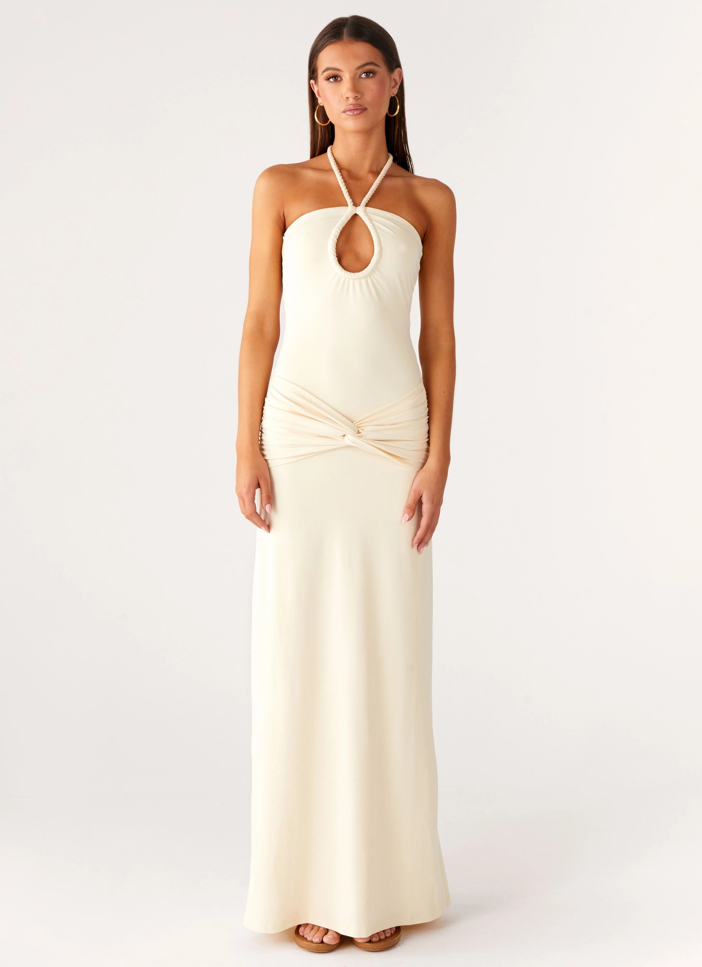 The Sacred Maxi Dress is made for glowing nights and golden skies. Featuring a halter neckline with front keyhole cut-out, ruched bustier and centre waist, and a low back finished with a thin neck tie strap. Crafted in stretch jersey and self-lined for a sleek fit.