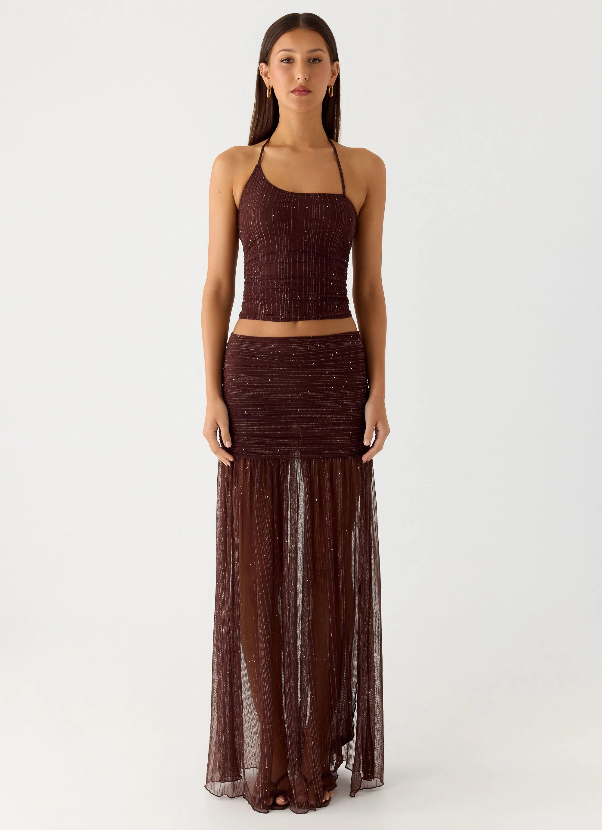 The Sparkling Night Top is made for golden hour nights and after-dark shimmer. Featuring an asymmetrical neckline and hem with a tie neck strap, this fully lined top is crafted in glitter mesh for a flirty, statement finish. Perfect for pairing with minis or tailored skirts for sunset-to-sundown styling.