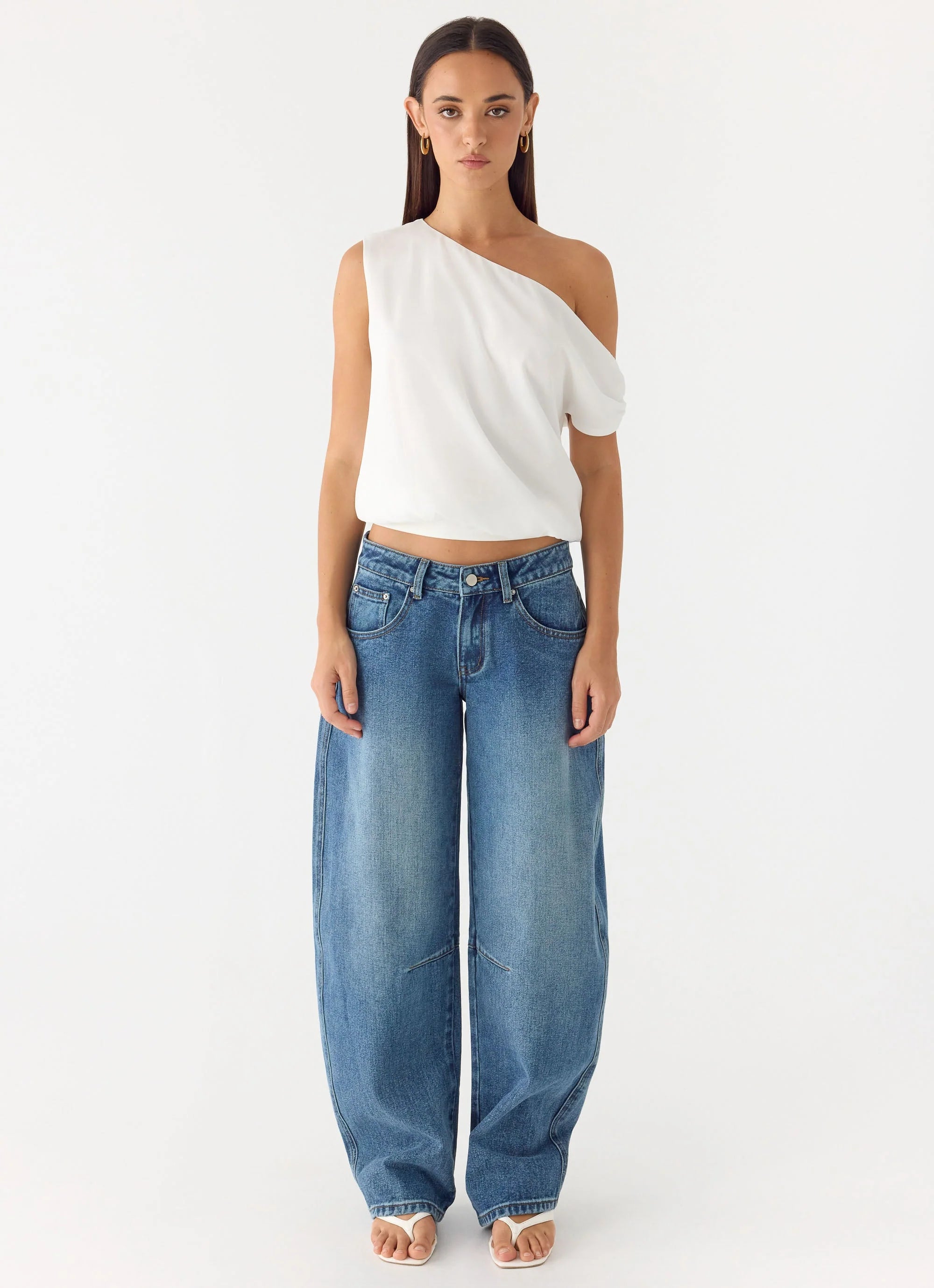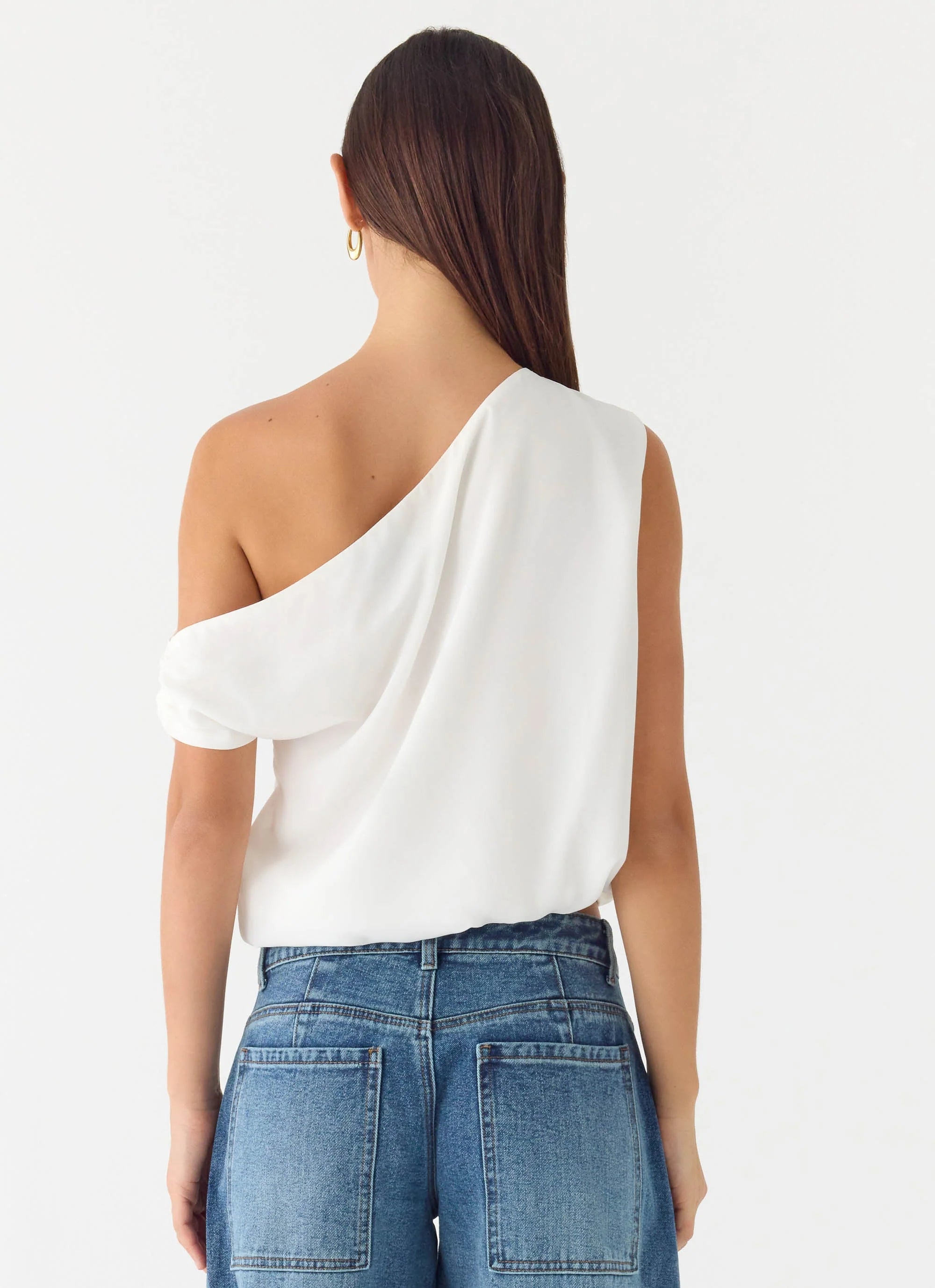 The Stick Around Top is made for evenings that move effortlessly from golden hour to nightfall. Featuring an asymmetrical off-shoulder design and blouson fit, this style combines a soft, flowing body with a stretch waistband for a flattering silhouette. Fully lined and cut in lightweight chiffon, it’s an editorial-ready piece for confident, playful nights.