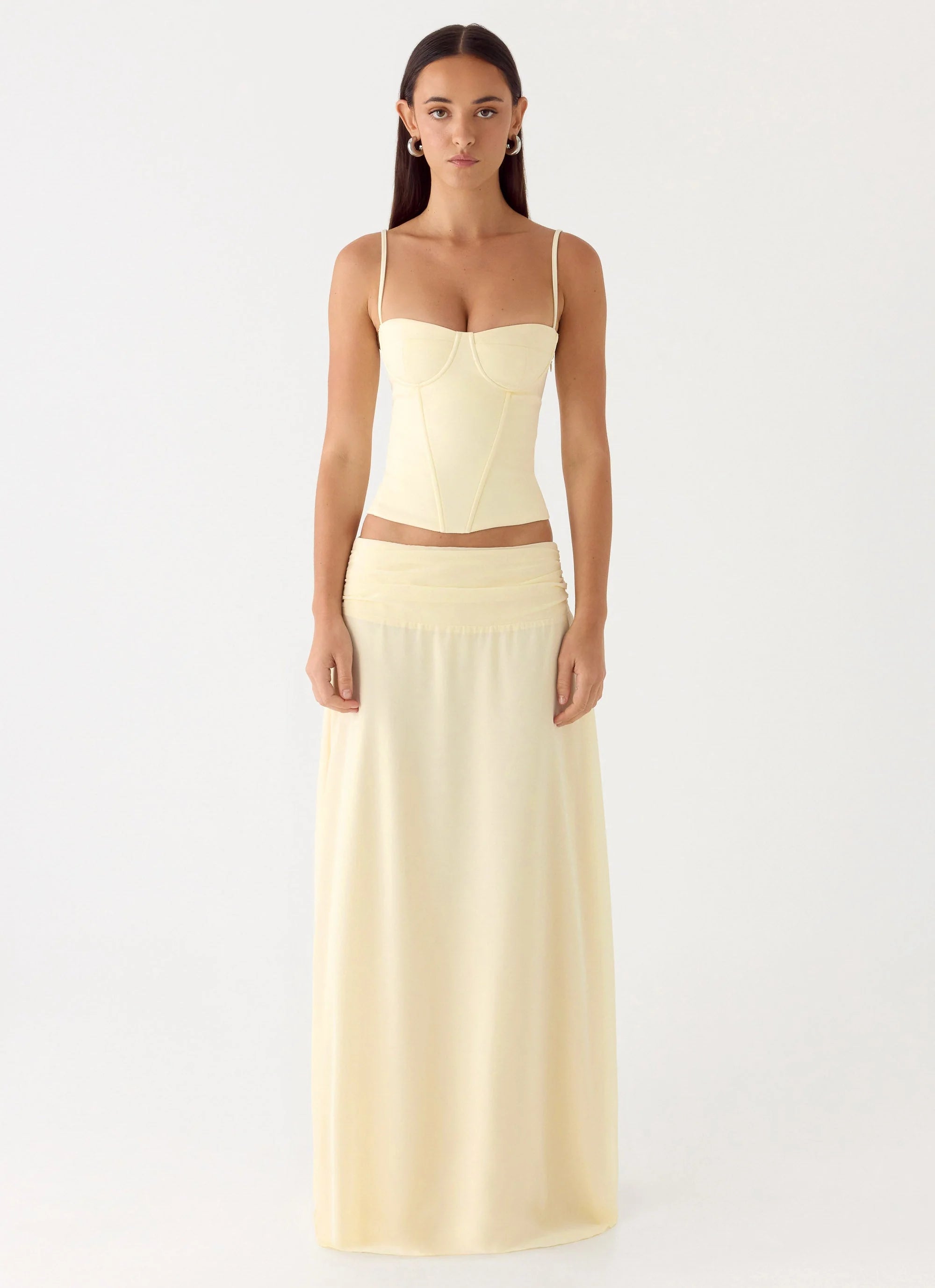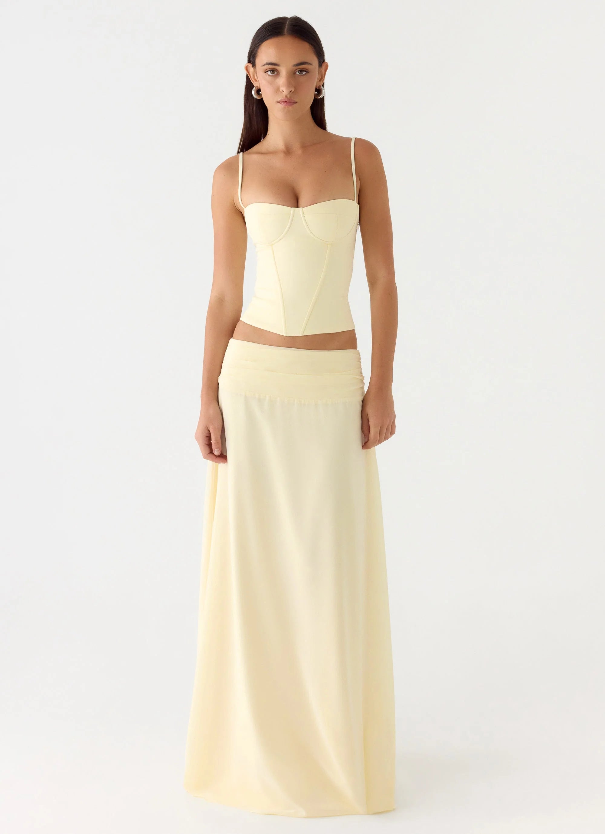 The Tayana Corset Top is made for sultry nights and statement silhouettes. Cut with a fitted corset shape, it features structured boning and padded bust cups for a sculpted finish. Adjustable straps and a sleek profile bring confident energy from sunset through to after dark.