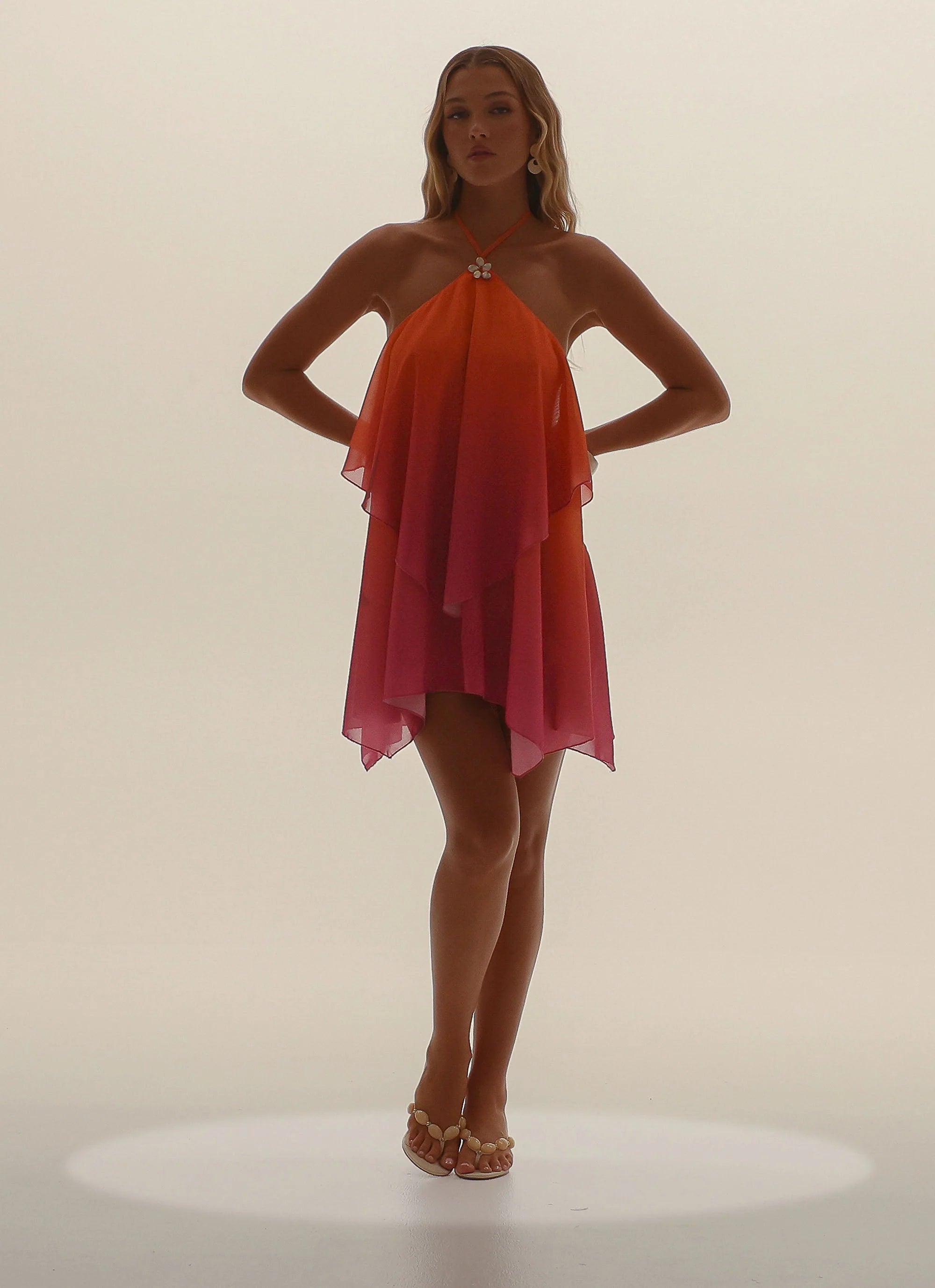 Twin Flame Mini Dress featuring an open back, halter neckline, and exclusive print. This bold, eye-catching dress is made to turn heads with its sultry silhouette and unique pattern, perfect for those unforgettable nights out.