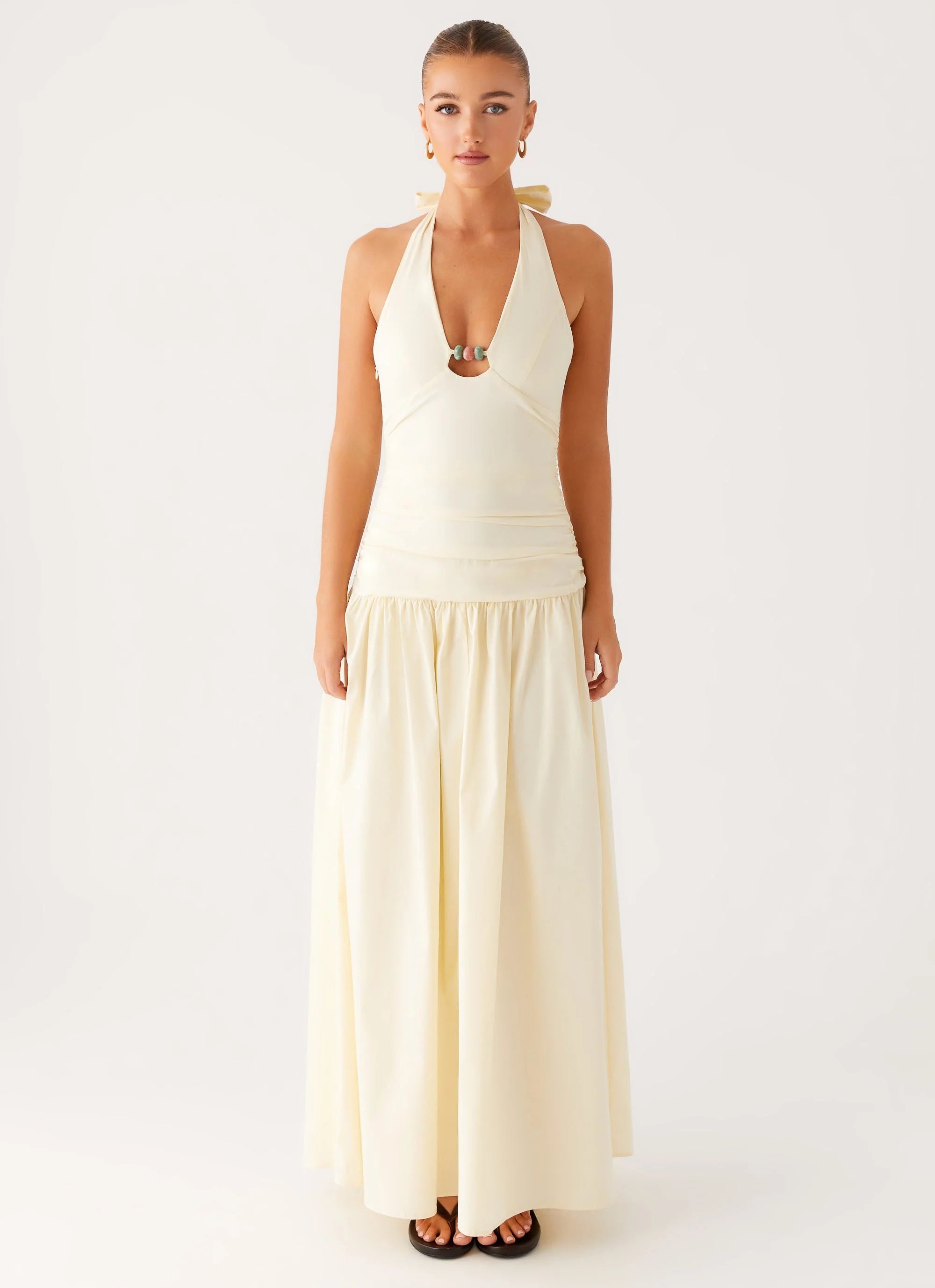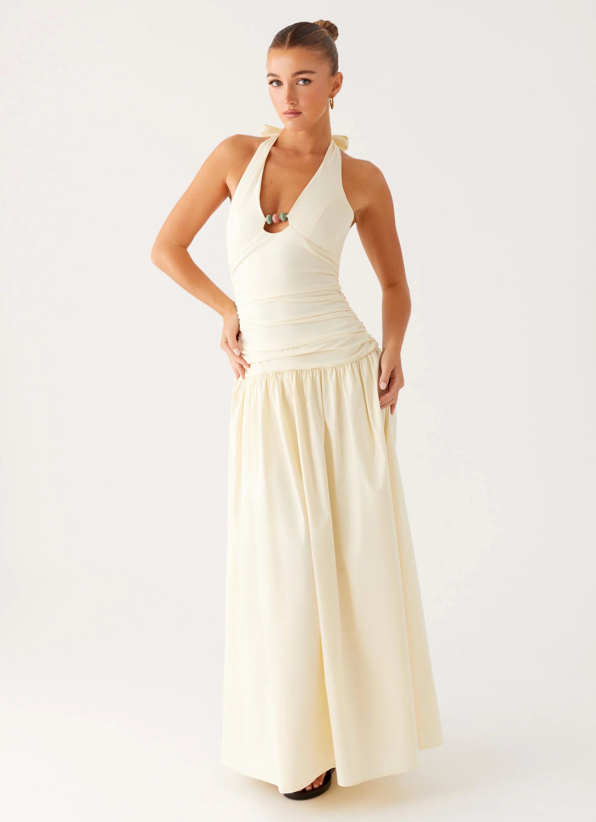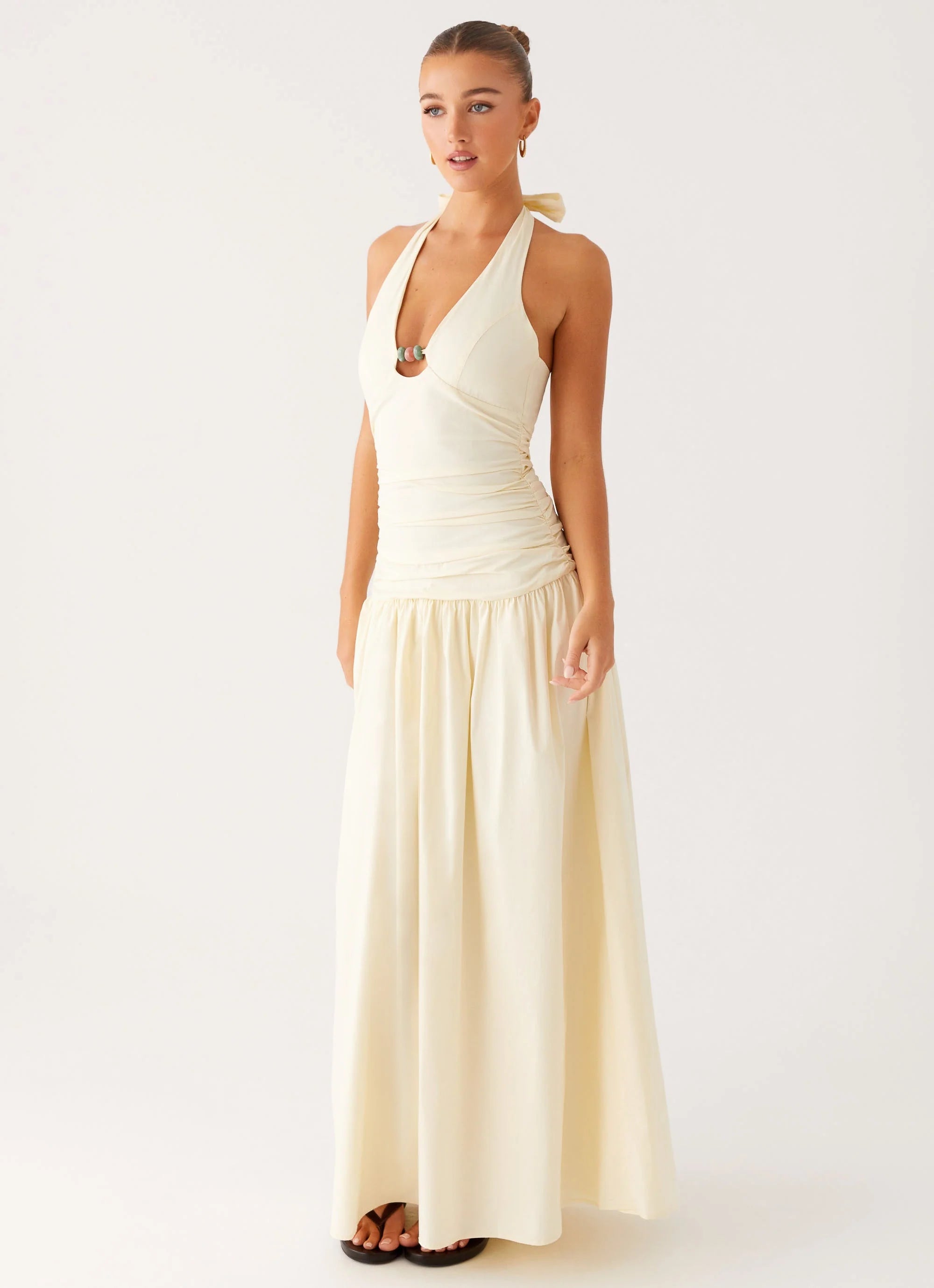 The Val Maxi Dress flows effortlessly with its ruched side, drop waistline, and shimmering front beading. A true statement piece for those who live for the spotlight.