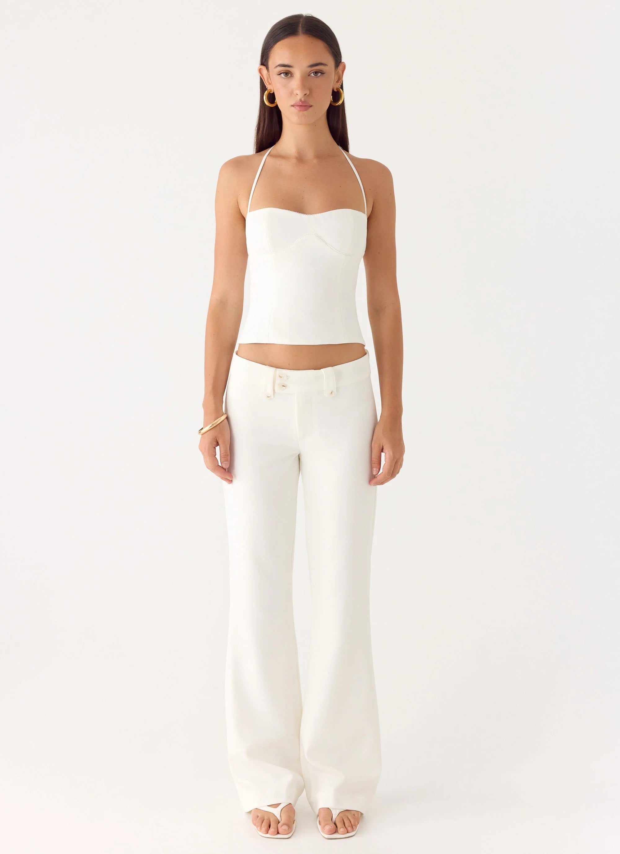 The Weiss Bustier Top brings a bold, sculpted edge to any evening look. Featuring a halter neckline with thin adjustable straps and corset-inspired shaping, it offers a flattering, tailored fit. Fully lined for comfort, this piece is designed to move seamlessly from sunset drinks to night-long adventures.
