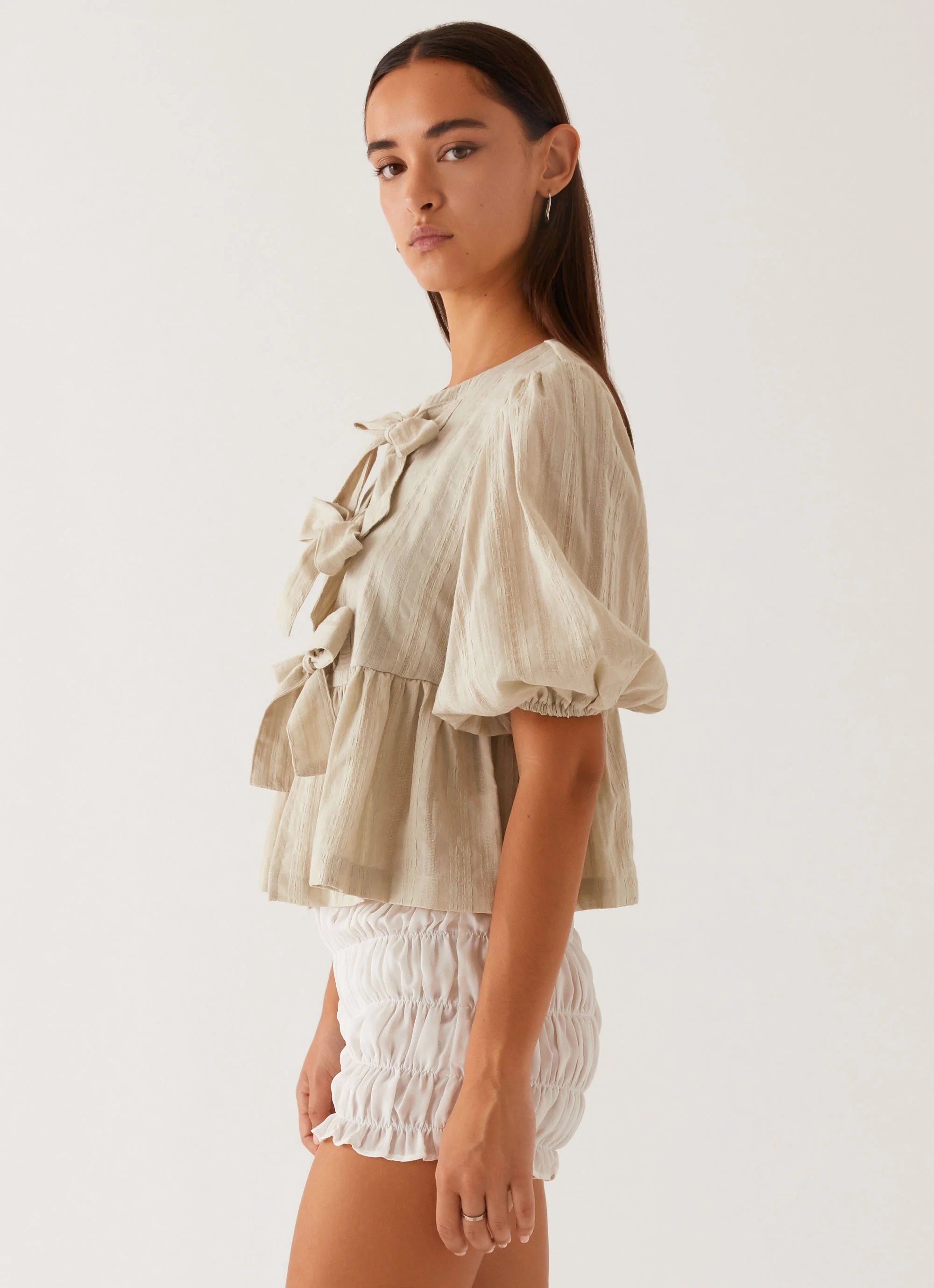 The Western Wind tie top is a standout piece that exudes effortless style. With a rounded neckline, three front tie details, and a flared, tiered hem, it offers a touch of elegance and playful movement.
