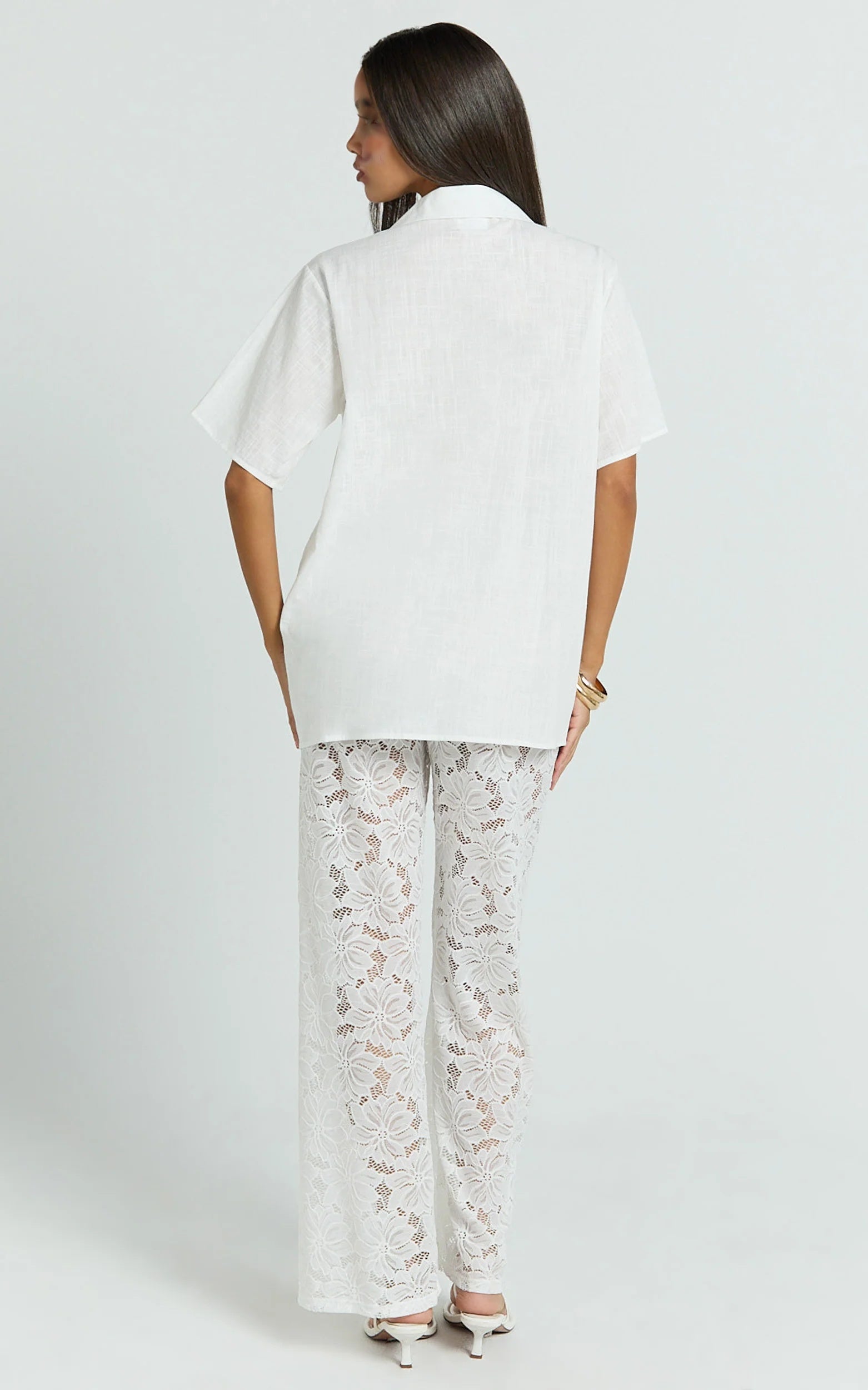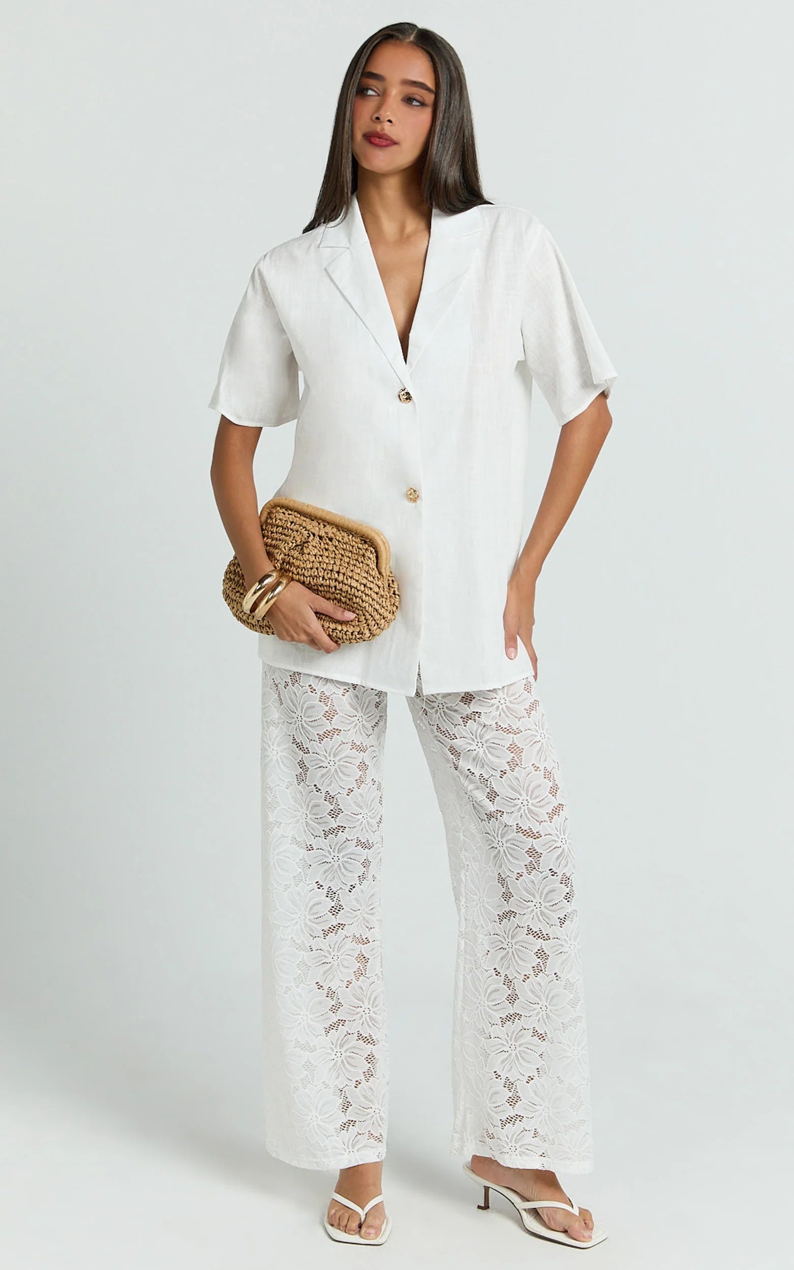 This two-piece set offers endless styling options: wear the pieces together for a monochromatic look or mix and match with your favorite separates. The breezy silhouette combines soft structure with delicate lace, making it ideal for long lunches, rooftop cocktails, and destination weddings. Complete the look with strappy heels and sleek hoop earrings for a polished party vibe, or add flats and a mini bag for a laid-back luxury feel.