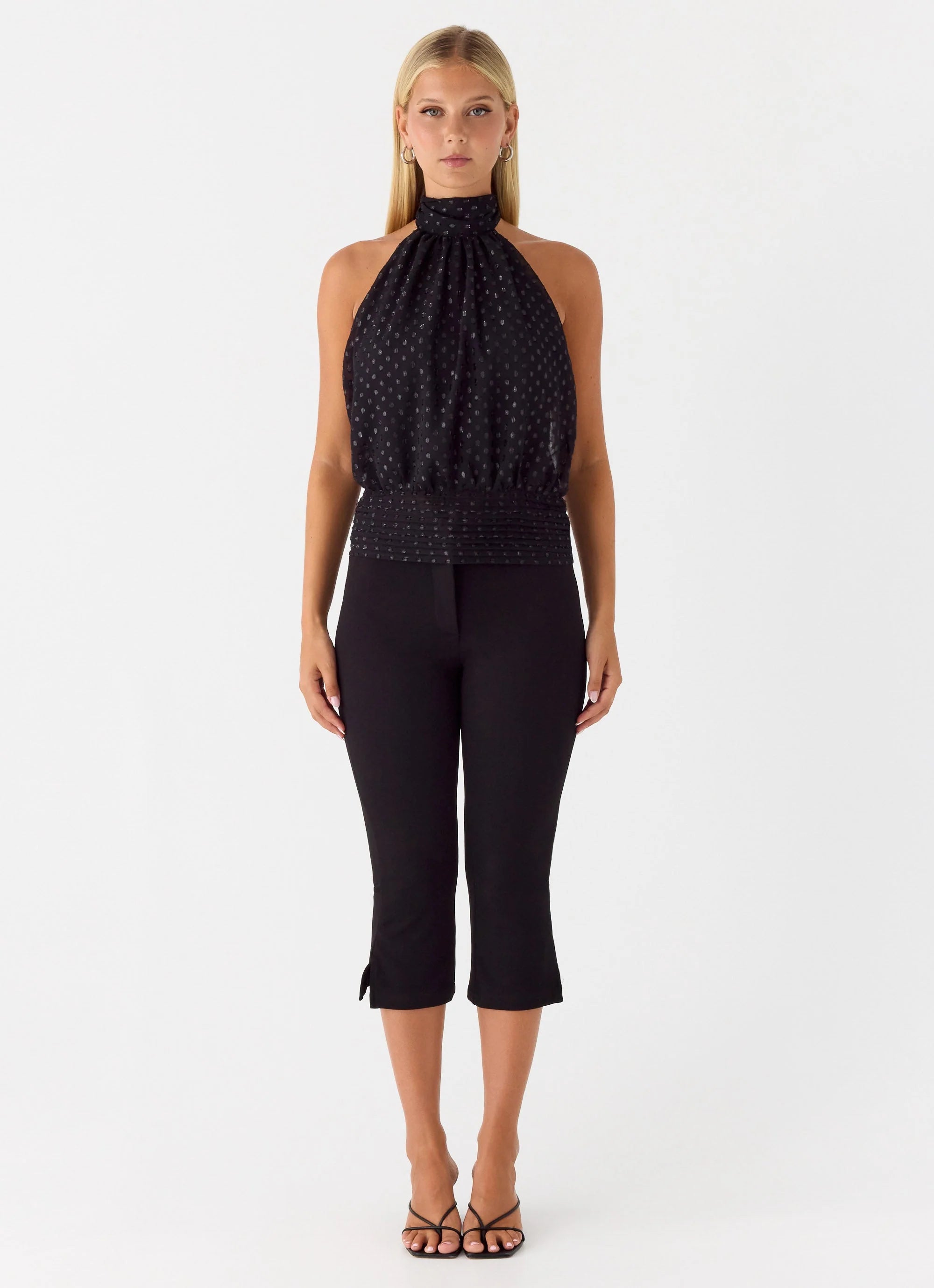 The Willow Chiffon Top captures a night-ready elegance with its halter neckline and thick neck tie strap. Fully lined with textured chiffon, it features an open back secured by a chic back tie—perfect for those golden hour moments that stretch into after-dark.